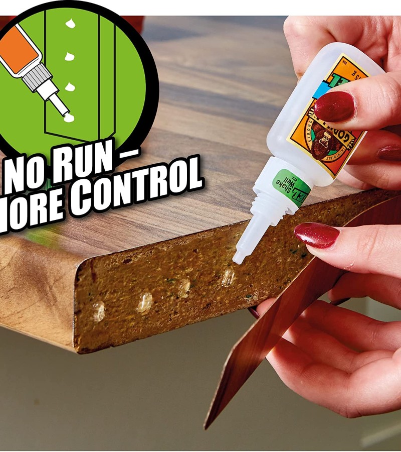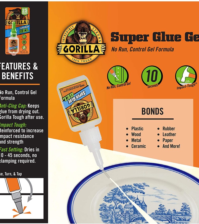 Gorilla Super Glue Gel is an easy-to-use, thicker and more controlled formula great for multiple surfaces and vertical applications. Developed for long-lasting repairs in an instant, the clear glue dries in 10–45 seconds. This super glue gel is specially formulated to absorb drops, impacts and shocks. Super glue, also referred to as cyanoacrylate glue, or CA glue, works on a variety of materials, including plastic, metal, fabric, stone, ceramic, paper, rubber and more.